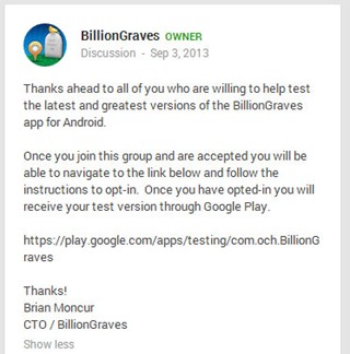 4. If you look at the Community Page, you will see a post on September 3rd, 2013 by Brian Moncur that contains a link to the Google Play Beta Application Download Site. This link WILL NOT WORK until you are approved to be a part of the BillionGraves Android Beta-Tester Community.