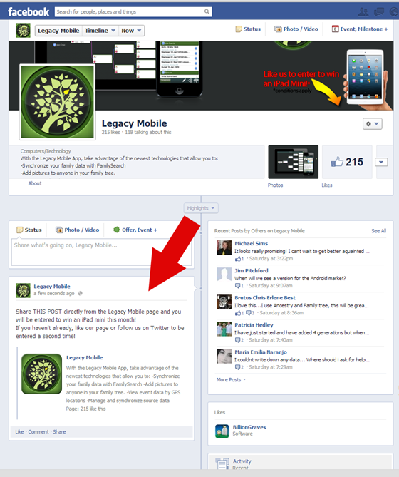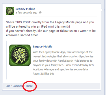 Help spread the word about this exciting new app with your Facebook and Twitter friends and be entered to win an iPad Mini simultaneously! And don’t forget, if you haven’t liked the Legacy Mobile Facebook page or followed Legacy Mobile on Twitter, you can still enter to win that way too! Good luck to you!